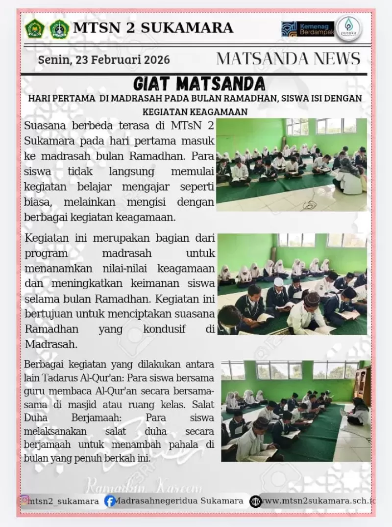 Suasana berbeda terasa di MTsN 2 Sukamara pada hari pertama masuk ke madrasah bulan Ramadhan. Para siswa tidak langsung memulai kegiatan belajar mengajar seperti biasa, melainkan mengisi dengan berbagai kegiatan keagamaan.