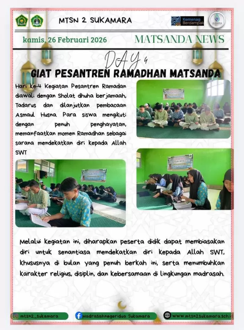 Hari ke-4 Kegiatan Pesantren Ramadan diawali dengan Sholat dhuha ber jamaah, Tadarus dan dilanjutkan pembacaan Asmaul Husna Para siswa mengikuti dengan penuh penghayatan, memanfaatkan momen Ramadhan sebagai sarana mendekatkan diri kepada Allah SWT.
