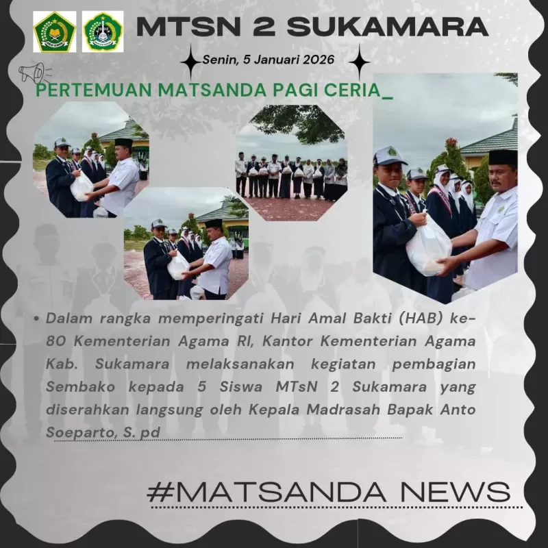 Dalam rangka memperingati Hari Amal Bakti (HAB) Kementerian Agama ke-80 Tahun 2026, Kantor Kementerian Agama Kab Sukamara kembali menegaskan komitmennya terhadap kepedulian sosial dengan menggelar kegiatan pembagian bingkisan berupa paket sembako.