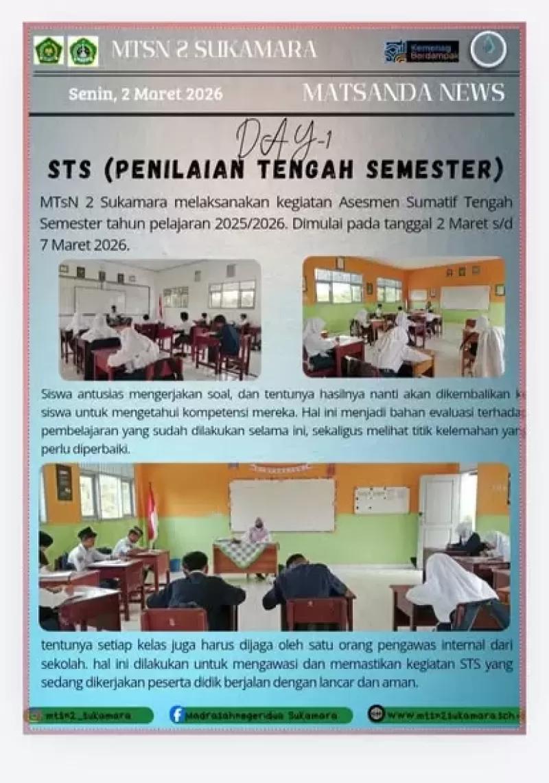 MTs Negeri 2 Sukamara melaksanakan kegiatan Asesmen Sumatif Tengah Semester tahun pelajaran 2025/2026. Dimulal pada tanggal 2 Maret s/d 7 Maret 2026.